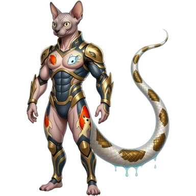 Hyper-realistic cute Japanese oriental Asian Edgy badass swimmy wet painted intricate ornate Japanese Asian koi-Minccino-Lykoi-Emolga-Sphynx-Linoone-Zangoose-fusion-hybrid-animal-Fakémon-creature, full body, thin long sleek scaly python tail, intricate markings emoji