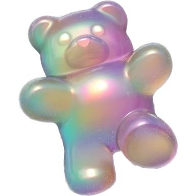 hyper-realistic 3D rendering of a translucent, glistening iridescent holographic gummy bear mid-bounce, its plump body captured in dynamic motion as if frozen in time. The surface refracts light like real gelatin, with sticky highlights gleaming along its curved edges and subtle sugar granules emoji