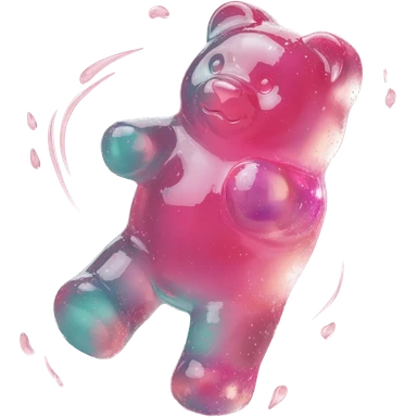 hyper-realistic 3D rendering of a translucent, glistening pink teal gummy bear mid-bounce, its plump body captured in dynamic motion as if frozen in time. The candy's surface refracts light like real gelatin, with sticky highlights gleaming along its curved edges and subtle sugar granules emoji