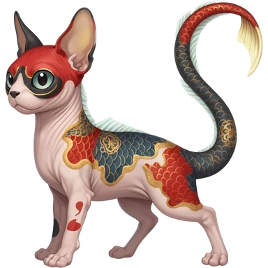 Hyper-realistic cute Japanese oriental Asian Edgy badass swimmy wet painted intricate ornate Japanese Asian koi-Minccino-Lykoi-Emolga-Sphynx-Linoone-Zangoose-fusion-hybrid-animal-Fakémon-creature, full body, thin long sleek scaly tail, intricate markings emoji