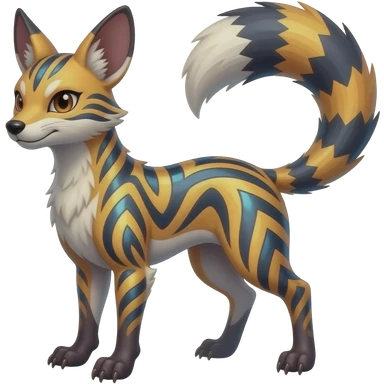 Hyper realistic obsidian fur etched with molten gold fault-lines and dark mirror shine beautiful elegant pretty precious cute Fakémon-Pokémon-opossum-feline-serval-caracal-chinchilla-Furret-Minccino-hybrid-creature with a big fluffy bushy tail (full body) emoji | AI Emoji Generator