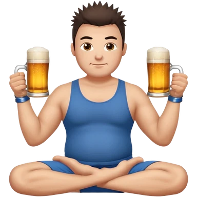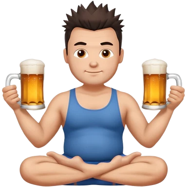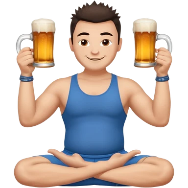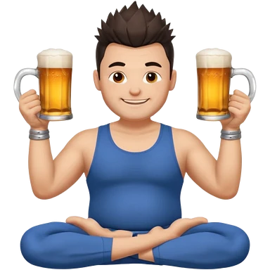 big slavic guy sitting in yoga pose, spiky short dark hair, holding beer mugs in two hands emoji