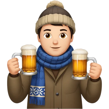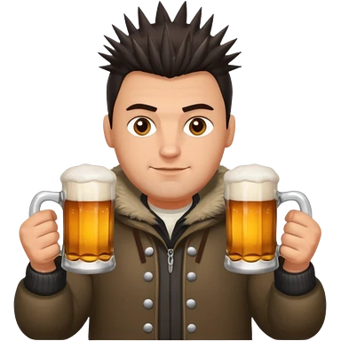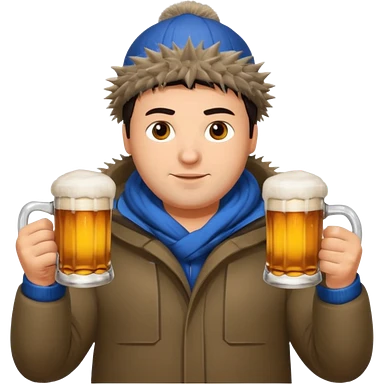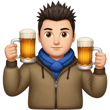big slavic guy sitting in yoga pose, spiky short dark hair, holding beer mugs in two hands, winter dressed emoji