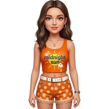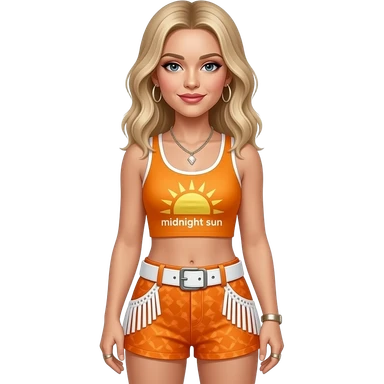 Zara Larsson wears an athletic-inspired stage look featuring a vibrant orange graphic tank top that says midnight sun spray painted on paired with orange patterned shorts. The ensemble is elevated by a white fringed belt emoji