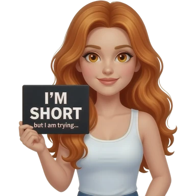 sexy girl with long wavy ginger hair and ginger eyes wearing a white tanktop is holding a black colored sign with I'M SHORT but I am trying... written on it emoji