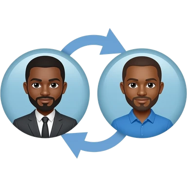 Icône d'entreprise en design plat montrant deux avatars de personnes africaines circulaires connectés par des flèches bidirectionnelles courbes, l'un en gris foncé portant un costume, l'autre en bleu décontracté. emoji