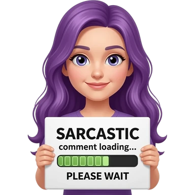 girl with long purple hair holding a SARCASTIC comment loading... PLEASE WAIT sign emoji