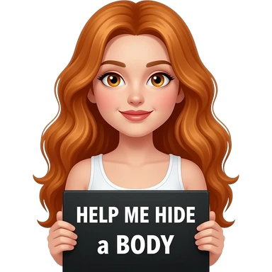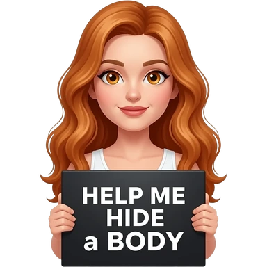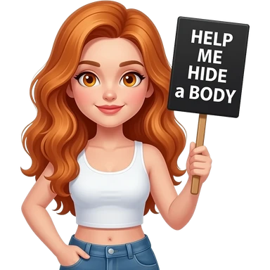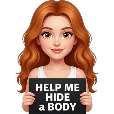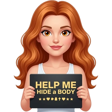 sexy girl with long wavy ginger hair and ginger eyes wearing a white tanktop is holding a black colored sign with HELP ME HIDE a BODY written on it emoji