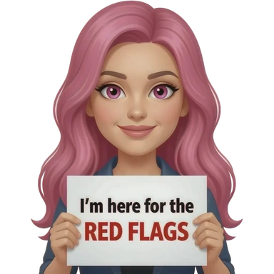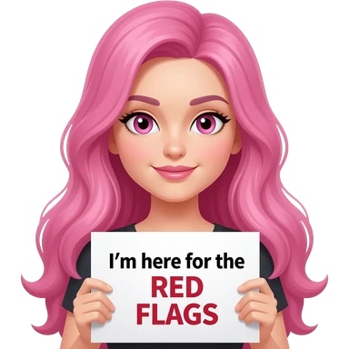 sexy girl with long pink hair and pink eyes wearing a holding a I'm here for the RED FLAGS sign emoji