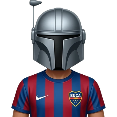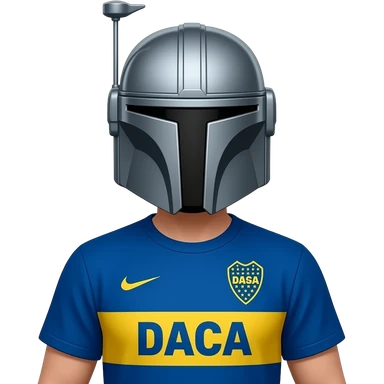 I need a Mandalorian wearing a Boca Juniors soccer jersey (an Argentine team) featuring the latest design, with the crest reading “CABJ” and the logo or sponsor on the yellow part of the jersey reading “Betsson.” emoji | AI Emoji Generator