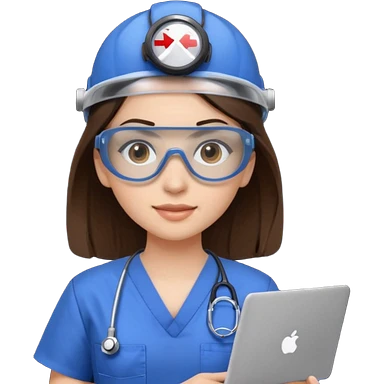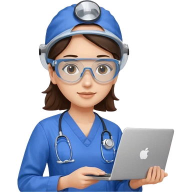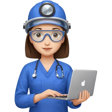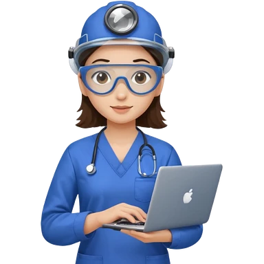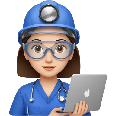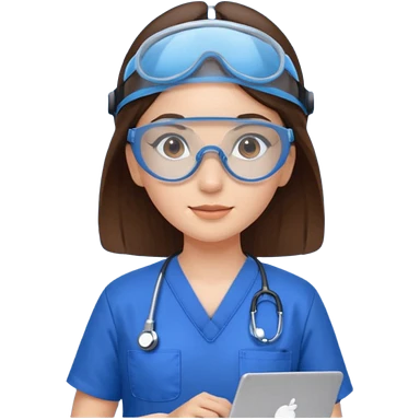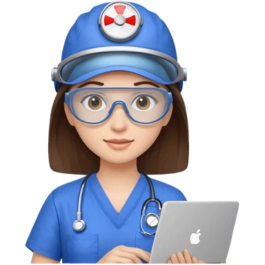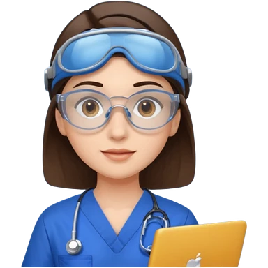 i need a brunette young woman in blue scrubs with brown eyes fair skin with safety goggles on and a laptop for research emoji