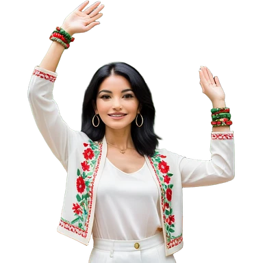 a woman with shoulder-length black hair is posing with a slightly smiling facial expression and hands raised to the side in a "I don't know" or "I see" gesture. She is wearing a white outfit with red and green floral prints, and accessories such as bracelets and earrings. The backdrop is a building with black-framed and glass windows that reflect the trees outside. There are also wooden chairs with iron on the left and right sides of the picture. At the top, an air-conditioning unit mounted on the wall can be seen. Natural light illuminates her face quite well, giving the photo a relaxed and natural feel. emoji