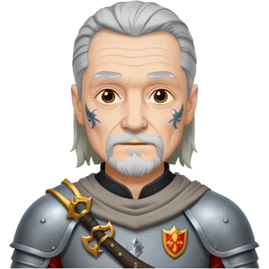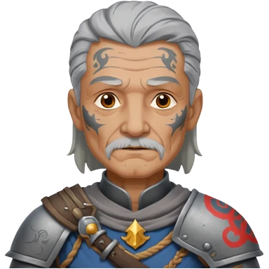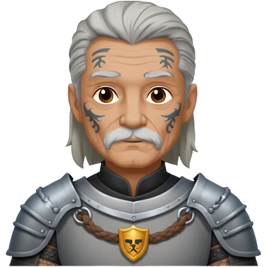 elderly tattooed knight, tattooed shoulder, long hair emoji