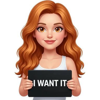 sexy girl with long wavy ginger hair and ginger eyes wearing a white tanktop is holding a black colored sign with I WANT IT written on it emoji