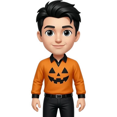 una persona con camisea de hallowen i los pantalones negros i que el pelo sea de color negro i que se le vea la cara emoji
