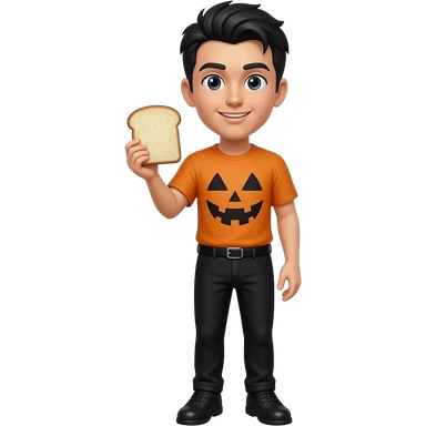 una persona con camisea de hallowen i los pantalones negros i que el pelo sea de color negro i que se le vea la cara i las piernas i pies i que tenga zapatos i con un troço de pan en un mano emoji