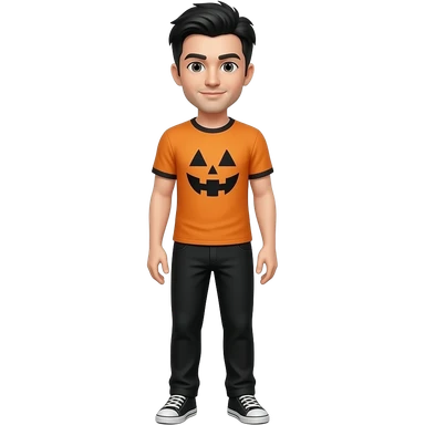 una persona con camisea de hallowen i los pantalones negros i que el pelo sea de color negro i que se le vea la cara i las piernas i pies i que tenga zapatos emoji