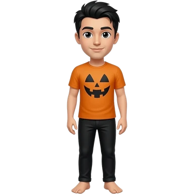 una persona con camisea de hallowen i los pantalones negros i que el pelo sea de color negro i que se le vea la cara i las piernas i pies emoji