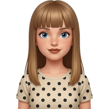 fille blanche avec une coupe de cheveux longue raide et une frange blond foncé, chatain clair, yeux bleu, tache de rousseur, rouge à lèvre marron, et t-shirt beige à pois noir emoji