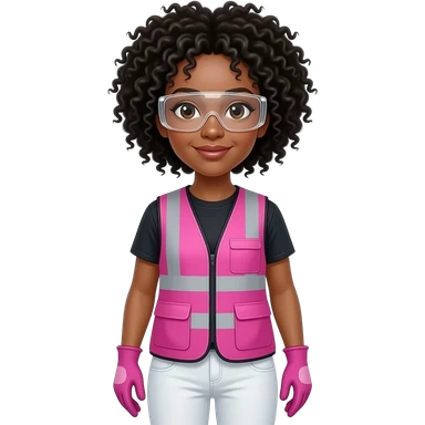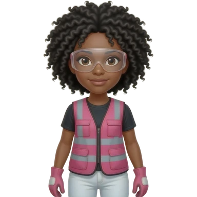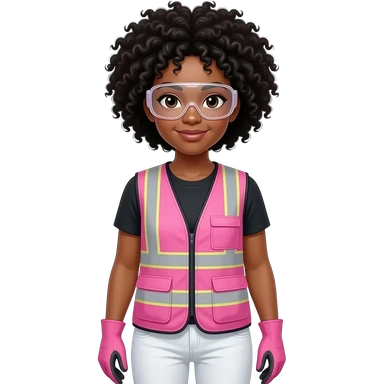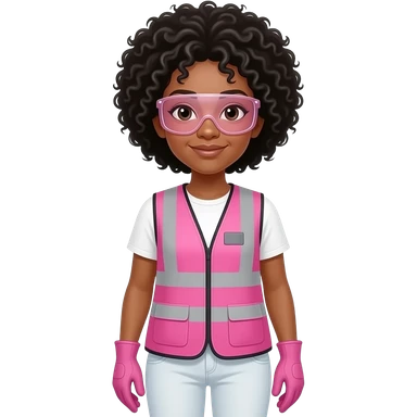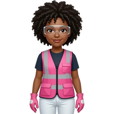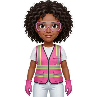 Biracial woman with black curly fro hairstyle wearing pink and clear safety glasses wearing a pink construction vest wearing white pans wearing pink construction vest wearing white pants wearing pink construction gloves emoji