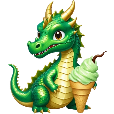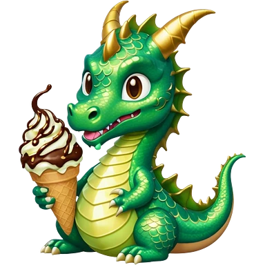 A shiny, glittery dragon in pink tones eats vanilla and chocolate ice cream emoji
