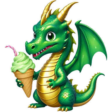 A dragon with its shiny glittered wings in pink tones and pink and gold legs, eats vanilla and chocolate ice cream emoji