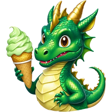A dragon in pink tones with its wings, pink and golden legs, and shiny glitter, eats a vanilla and chocolate ice cream. emoji