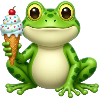 cute frog eating ice cream, happy face, holding a colorful ice cream cone, 3D cartoon, mobile game icon style, bright colors, soft shadows, clean background, no text, no watermark emoji
