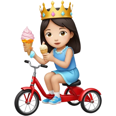 Asian girl riding a tiny tricycle wearing a crown eating ice cream emoji