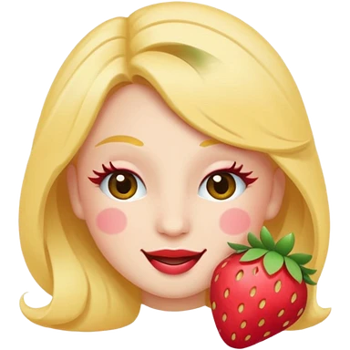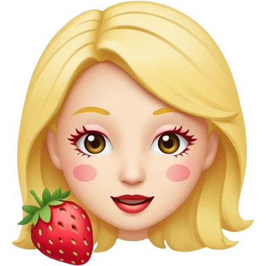 Emoji coquette, winking face with tiny strawberry sticker on cheek, fluttering eyelashes, pastel peach background, minimal vector, 512x512, transparent background emoji