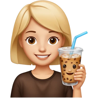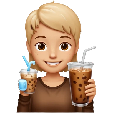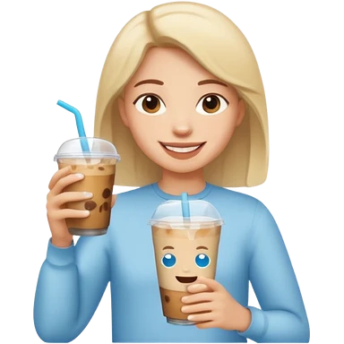 aesthetic white girl with blonde wavy hair and brown eyes sipping an iced americano in a cute coffee shop emoji