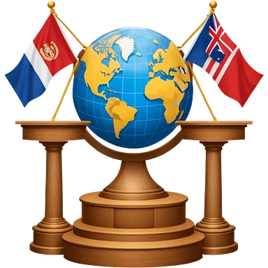 icon featuring podium with a speaker,russian and american flags, and voting ballots. The design includes a globe and scales of justice in the background, representing governance, global affairs, and political theory. Transparent background emphasizes civic engagement and policy.emoji