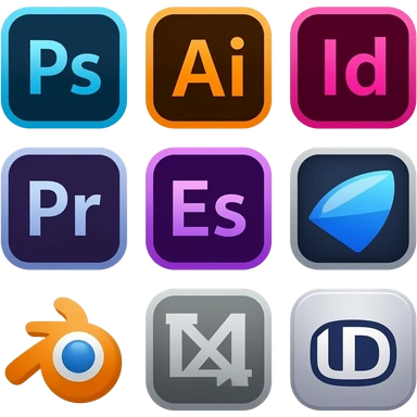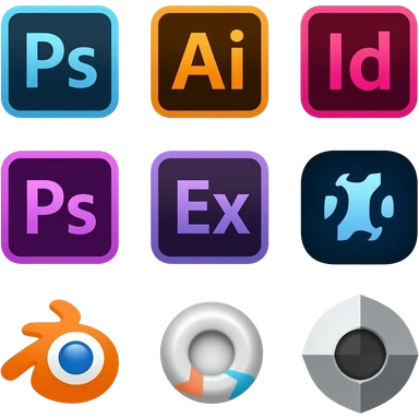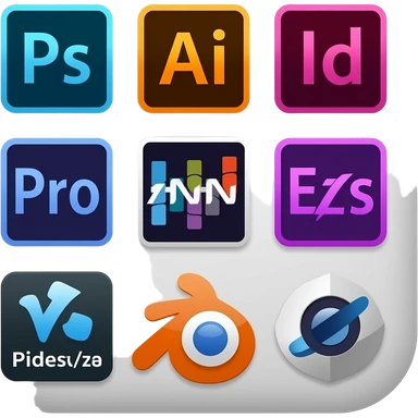 un carre avec l'icone des logiciels suivant: photoshop, illustrator, indesign, premier pro, after effects, davinci resolve, blender, cinema 4D emoji
