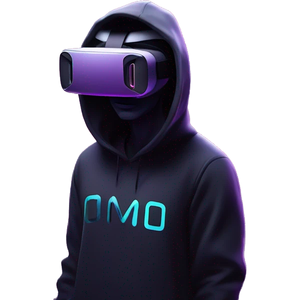 Ilon Mask wearing a black hoodie with "OMG" letters on it and VR headset oculus quest 2 in a cyberpunk VR environment with violet neon lighting. emoji | AI Emoji Generator