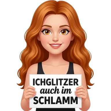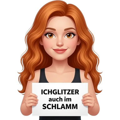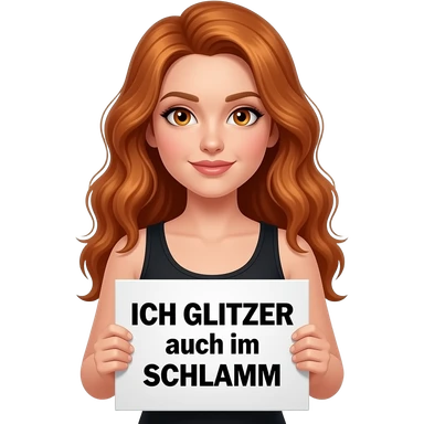 sexy girl with long wavy ginger hair and ginger eyes wearing a black tanktop is holding a white colored sign with ICH GLITZER auch im SCHLAMM written on it emoji