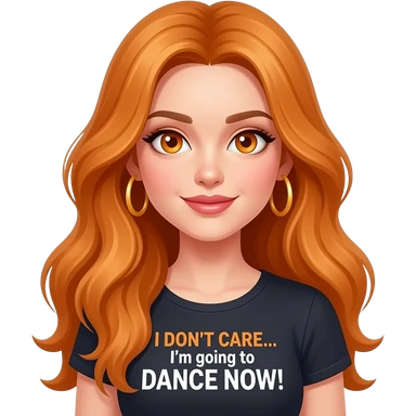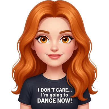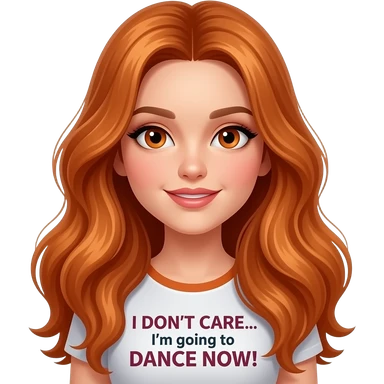 sexy girl with overlong ginger hair and ginger eyes a top with I DON'T CARE... I'm going to DANCE NOW! written on it emoji