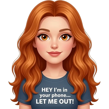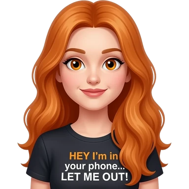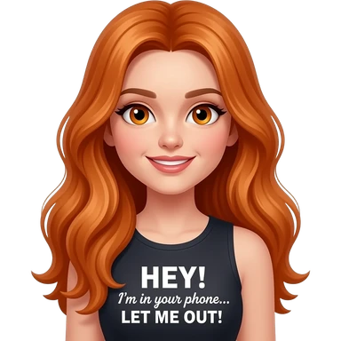 sexy girl with overlong ginger hair and ginger eyes a top with HEY! I'm in your phone... LET ME OUT! written on it emoji