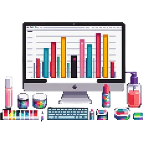 iMac computer with bar charts and beauty products like lipstick, nail polish, cream jars on the screen emoji