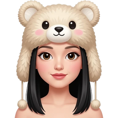 Image hyperréaliste et accrocheuse d'une femme asisatique au cheveux droit noir avec un bonnet en fourrure beige kawaii sur la tete. Ajoute subtilité pour renforcer l'impression de luxe de la scène. L'ensemble est isolée sur un fond blanc. emoji