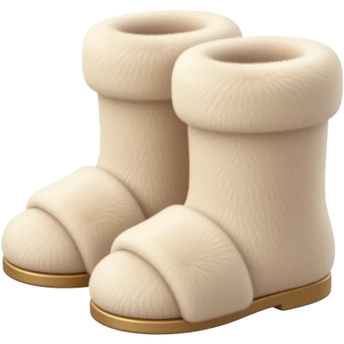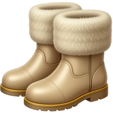 Image hyperréaliste et accrocheuse de bottes en fourrure beige kawaii. La vue est en 3/4 Ajoute subtilité pour renforcer l'impression de luxe de la scène. L'ensemble est isolée sur un fond blanc. emoji