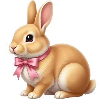 Image hyperréaliste et accrocheuse d'un lapin assis avec un ruban rose pastel au cou. La vue est en 3/4 Ajoute subtilité pour renforcer l'impression de luxe de la scène. L'ensemble est isolée sur un fond blanc. emoji