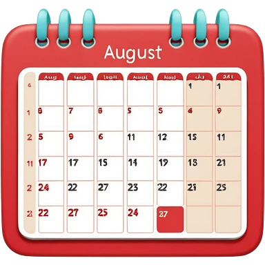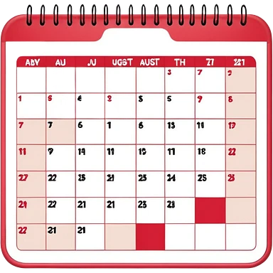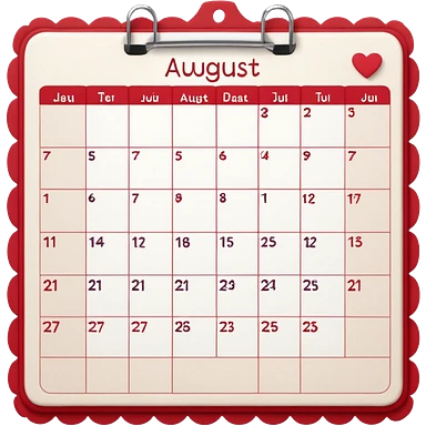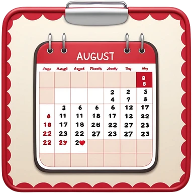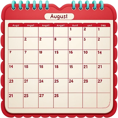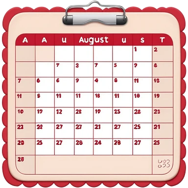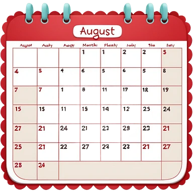a monthly calendar labeled “August,” with rounded square date boxes, scalloped border frame, playful red doodle lines, and a cozy planner vibe. Minimal kawaii style, flat pastel color palette, slightly imperfect sketch lines, centered object, no background emoji