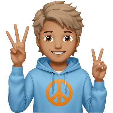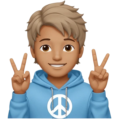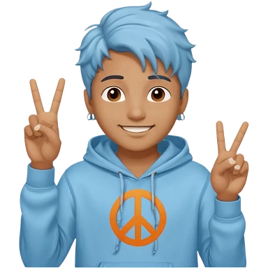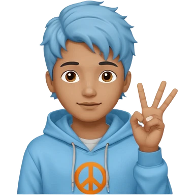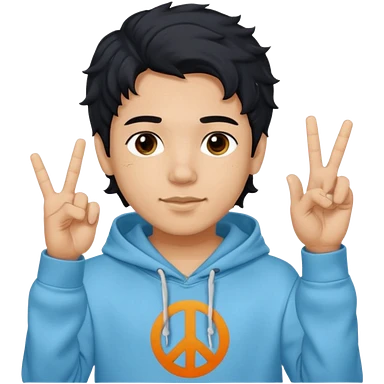 An indian boy in a light blue hoodie with wavy flow hairstyle showing peace sign, with black hair color, apple memoji style emoji