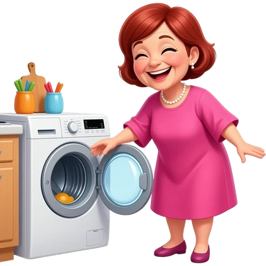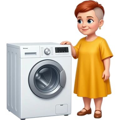 elderly small woman.razor cut very short red hair.wearing bright loose fitting dress in love with her new washing machine emoji