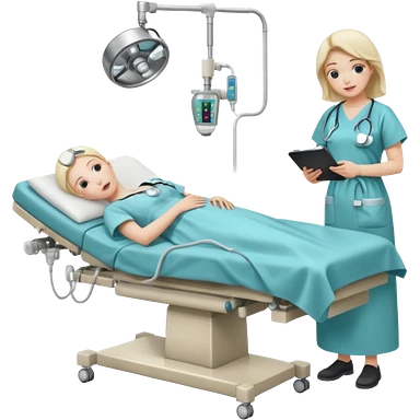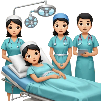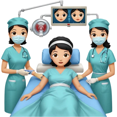 A colonoscopy procedure in progress in a clean operating room, featuring a black-haired woman in her 50s lying on an examination bed, with three doctors wearing surgical caps, masks, and gowns performing the procedure. emoji