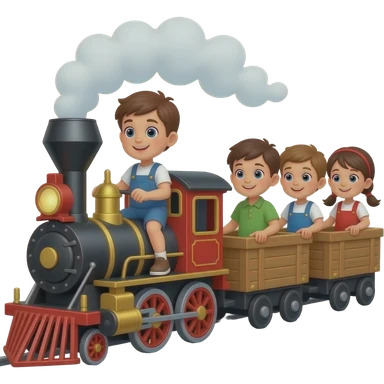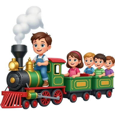 A kid riding on a full sized toy steam train and the other kids are on the wagons emoji
