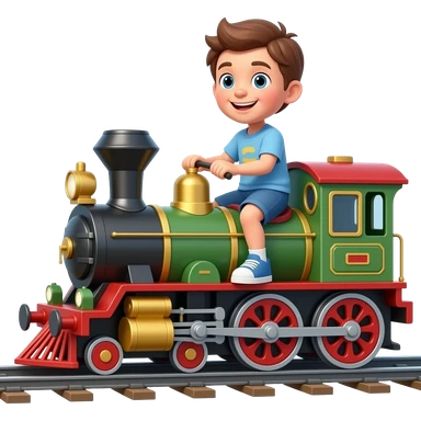 A kid riding on a full sized toy train on the track emoji