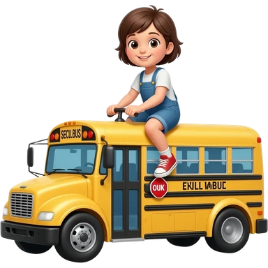 A kid riding on a full sized toy school bus emoji