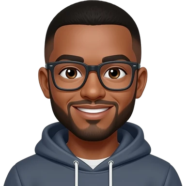 black man in his 20s with buzzcut. dark brown eyes. beard. glasses. smiling. wearing a hoodie. emoji