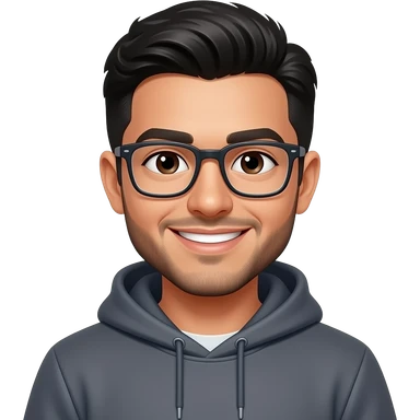latino man in his 20s with short black hair. dark brown eyes. beard. glasses. smiling. wearing a hoodie. emoji